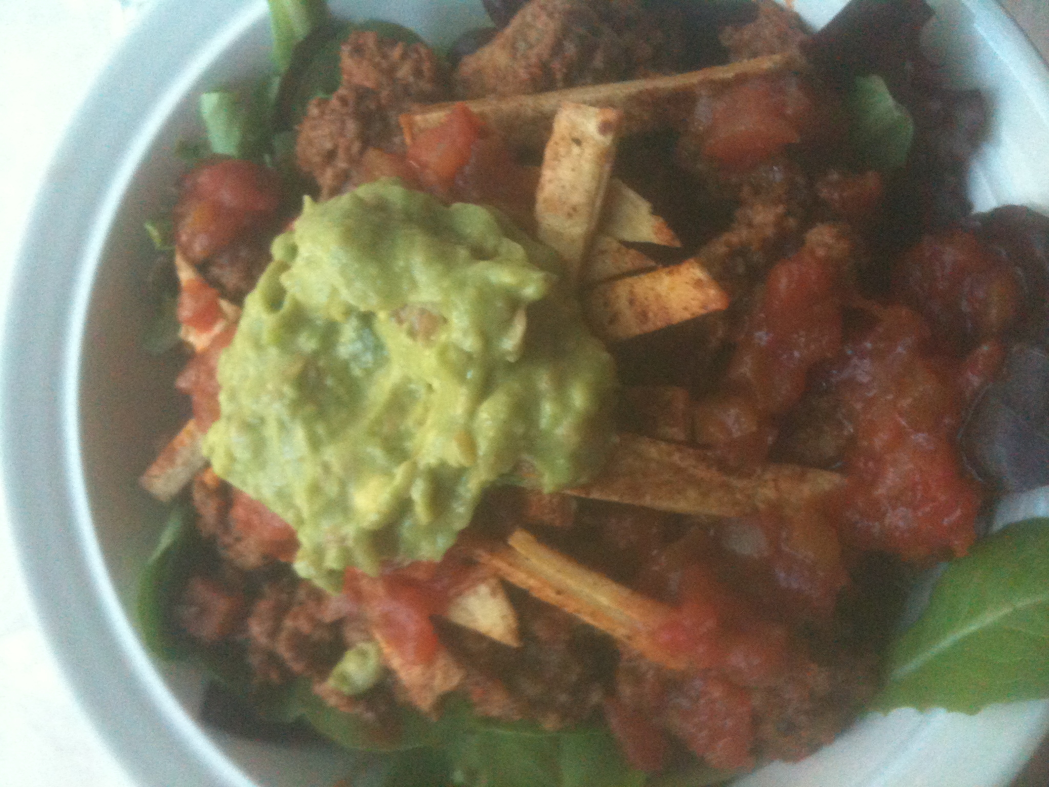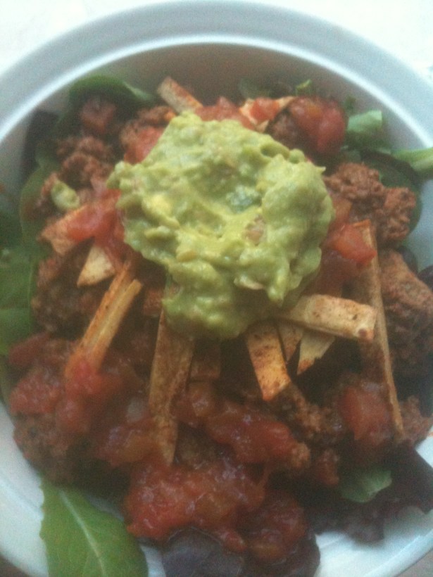 This is kind of a staple in our weekly menu’s. We usually go back and forth between organic beef tacos and organic beef taco salad. But I like incorporating these recipes into the challenge because it is a part of our life. Probably one of the easiset and I served homemade baked Chips and homemade Guacamole for an appetizer. The ingredients for this salad include – ground beef (cooked with a combo of lime, pepper salsa and taco seasoning), homemade baked tortilla strips, guacamole, black beans, green peppers, tomatoes, and salsa (used as the salad dressing).