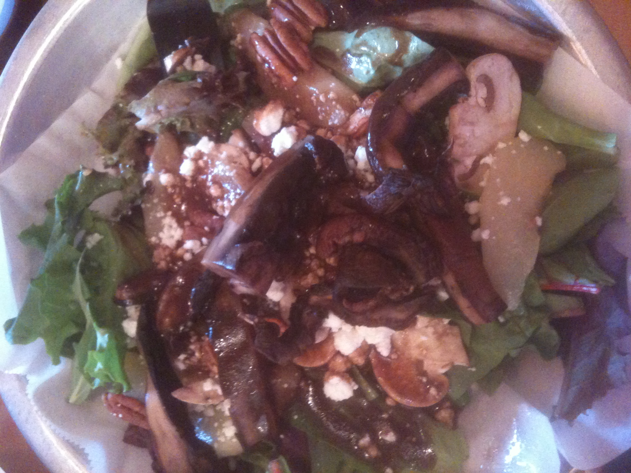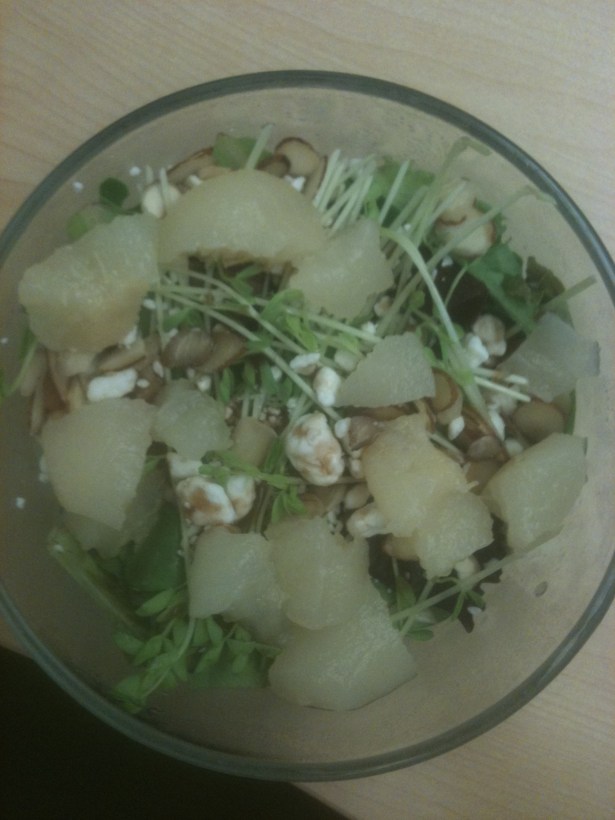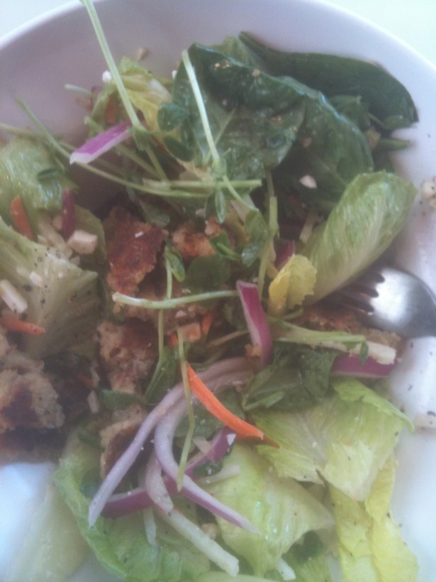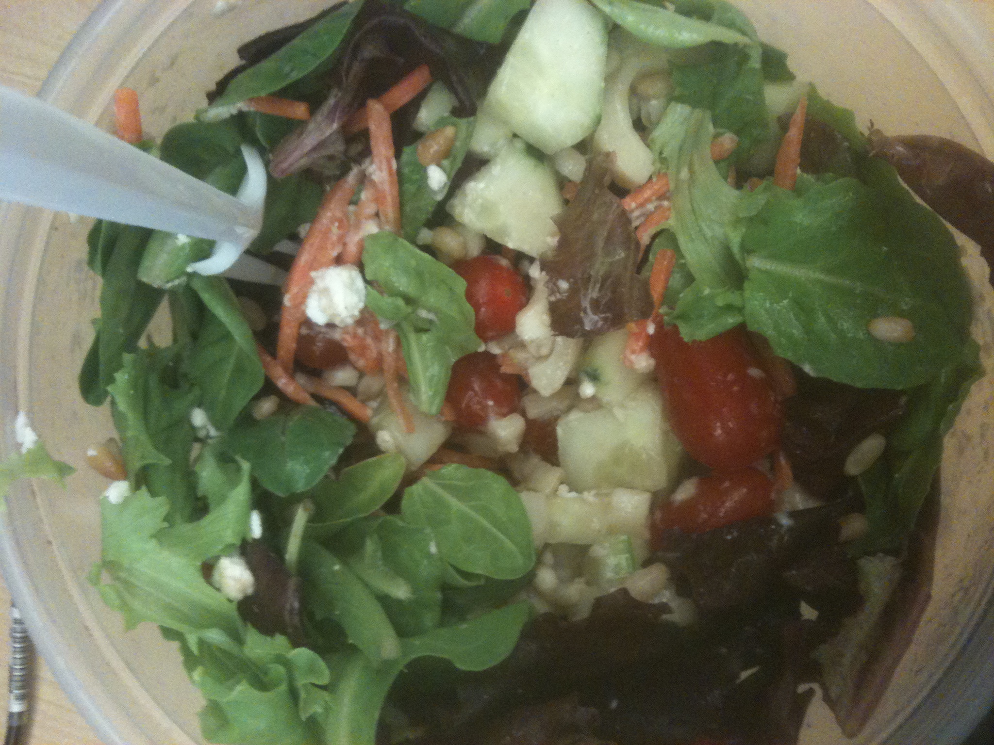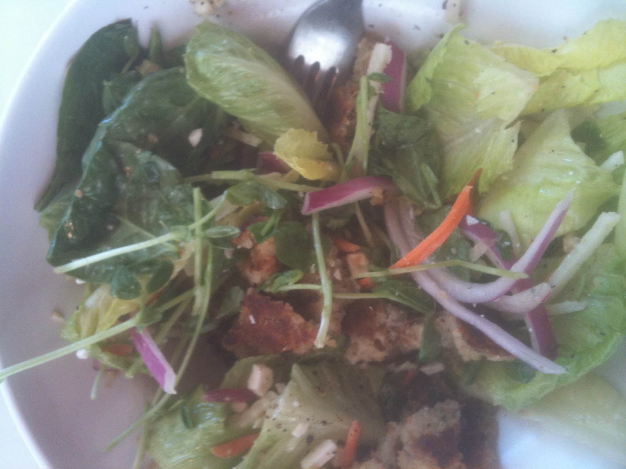 This recipe was actually given to me by a friend (thanks JD)! I made this for lunch because I had plans for a company dinner in the evening. It included mixed greens, pears (I used canned), goat cheese, sliced almonds, pea tendrils, and my favorite fat free balsamic vinaigrette (Trader Joe’s). She actually has a recipe for a homemade dressing (vinegar, olive oil, honey, paprika, salt, and pepper), but I didn’t have enough time to put it together before I left for the day. Either way it was delicious!