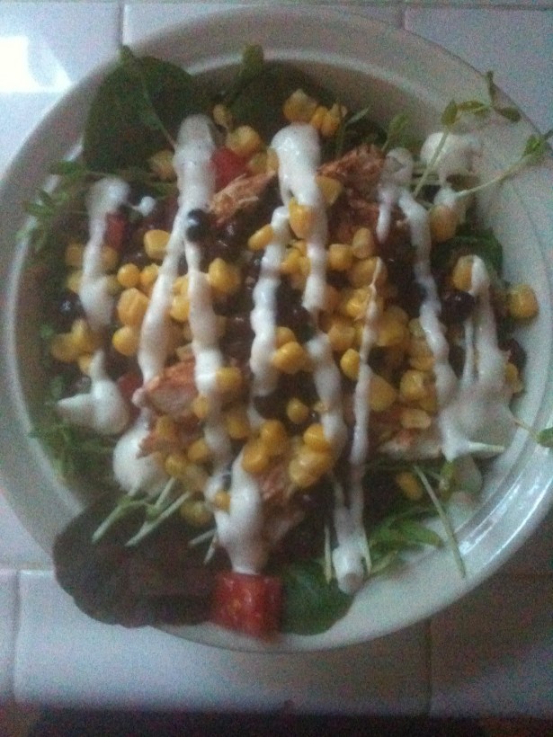 You now know I won’t eat chicken unless its organic so I never get to enjoy all the different types of BBQ chicken salad’s out there. So I decided to make it for dinner and it included – spring mix, BBQ chicken, light ranch dressing, tomatoes, pea tendrils (my new favorite ingredient), black beans, and corn. I need to learn how to make my own ranch dressing though…