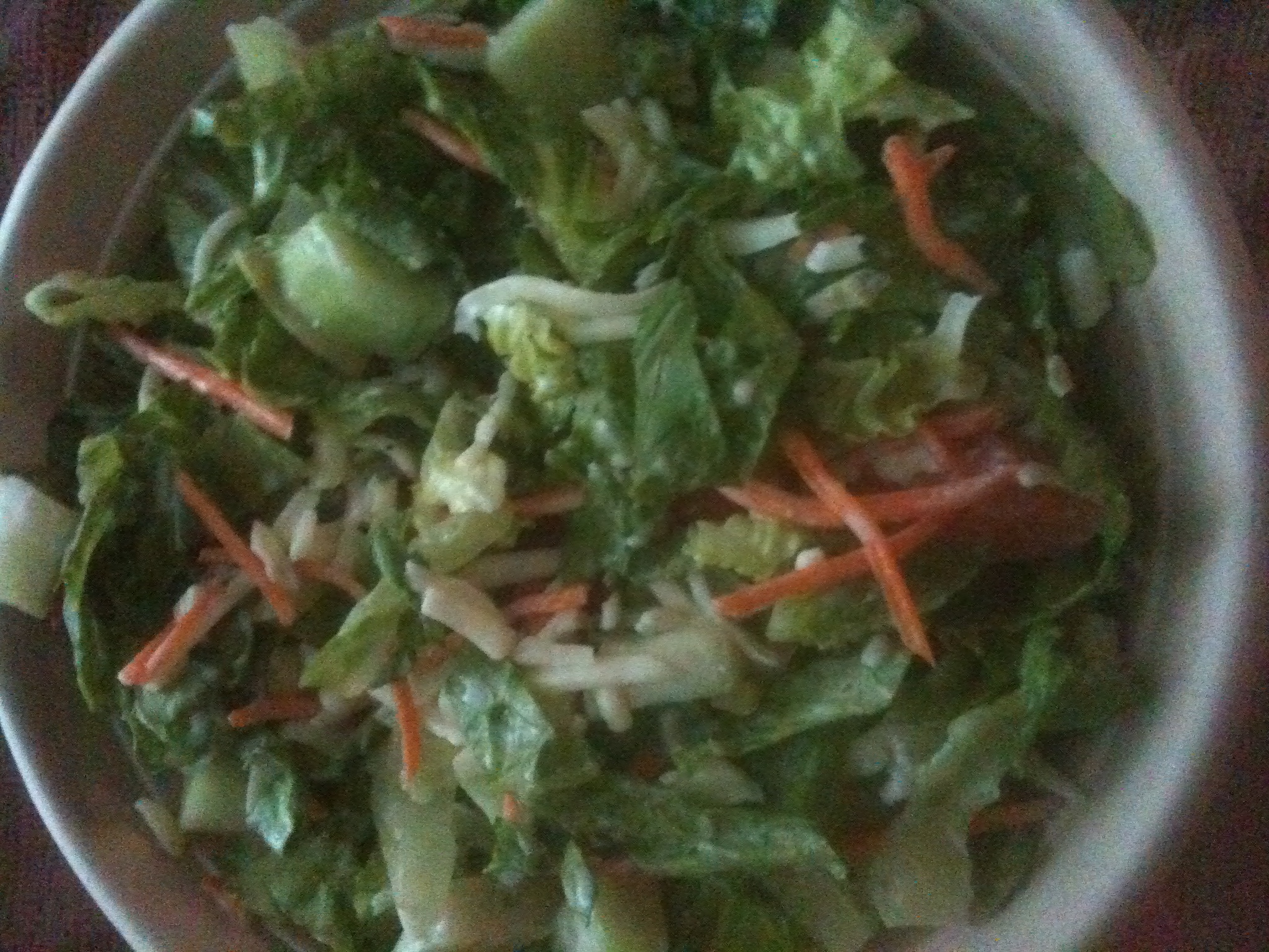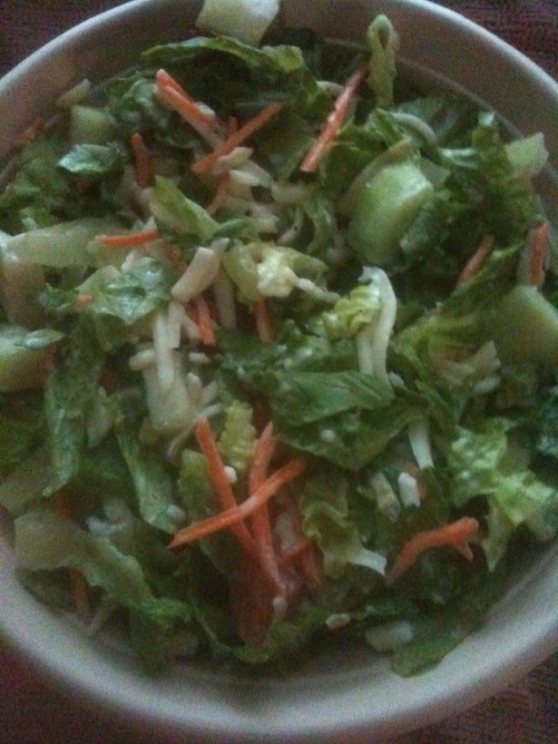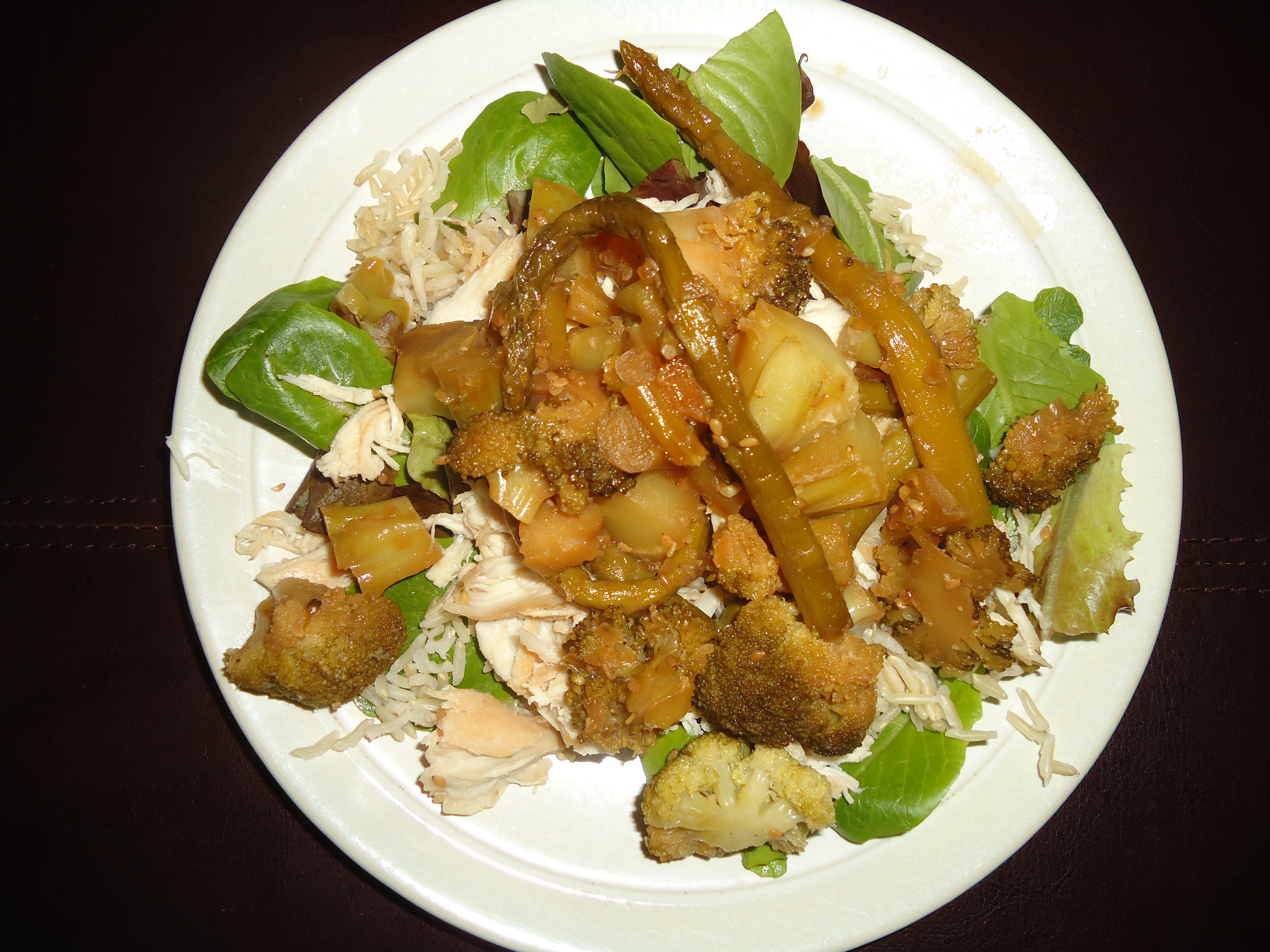 Marinated the chicken in the crockpot with teryaki sauce, cooked some brown rice in the rice cooker, sauted some vegetables (broccoli and asparagus) with some olive oil and teriyaki sauce in a pan on the stovetop. After it was completed I plated it starting at the bottom with lettuce, brown rice, vegetables, and shredded chicken. To be honest, I totally made this recipe up because I was just going to make a chinese chicken salad but I knew my husband would complain there weren’t enough carbohydrates on the plate. Unfortunately, out of this entire month I have only had one miss and that was today. The reason it was a miss was because I sauted the vegetables in teriyaki and they lost their flavor. I would steam the veggies next time and find a yummy teriyaki drizzle to pour over the top for garnish and a little extra flavor.