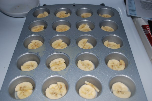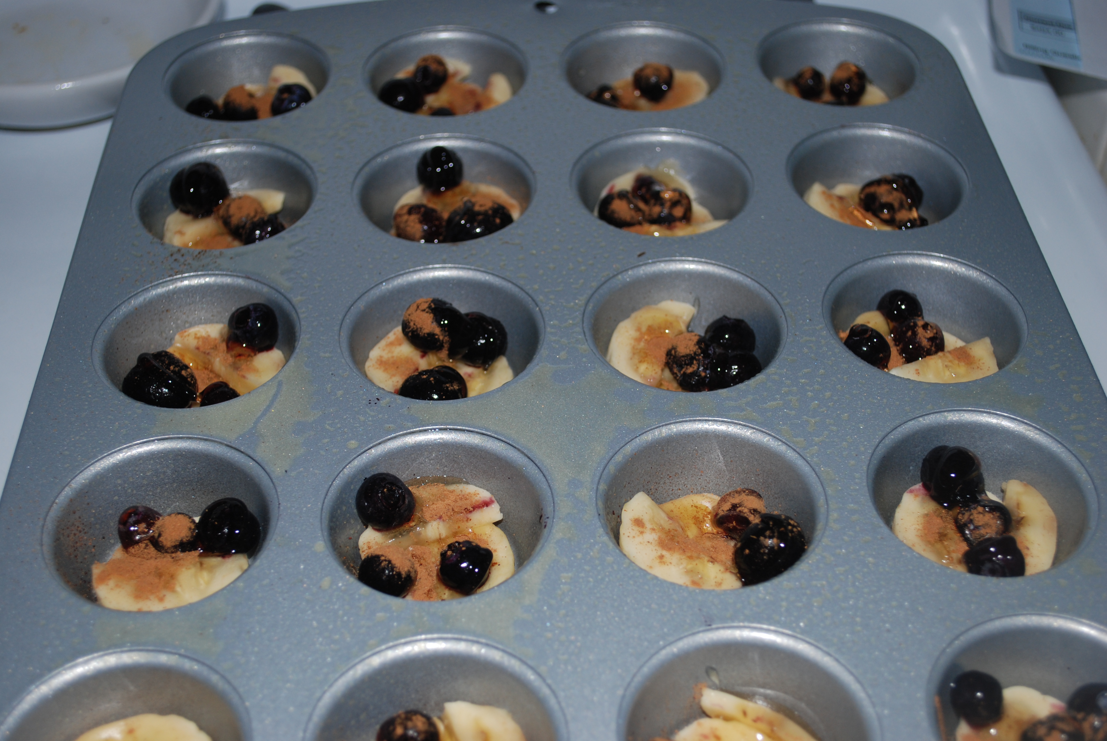 Place the sliced bananas in a single layer on the bottom of the pan. Add the blueberries on top of the sliced bananas, 1/4 tsp of cinnamon, 1 tbsp of the honey and cover with foil. Bake for 7 minutes (if doing muffins and longer if doing bars) or until the bananas get soft.