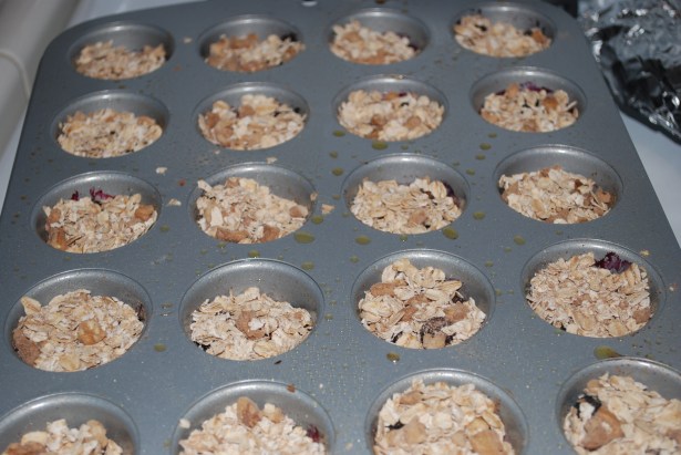 While the fruit is baking, combine the dry ingredients – oats, nuts, baking powder, remaining cinnamon, salt and mix together.