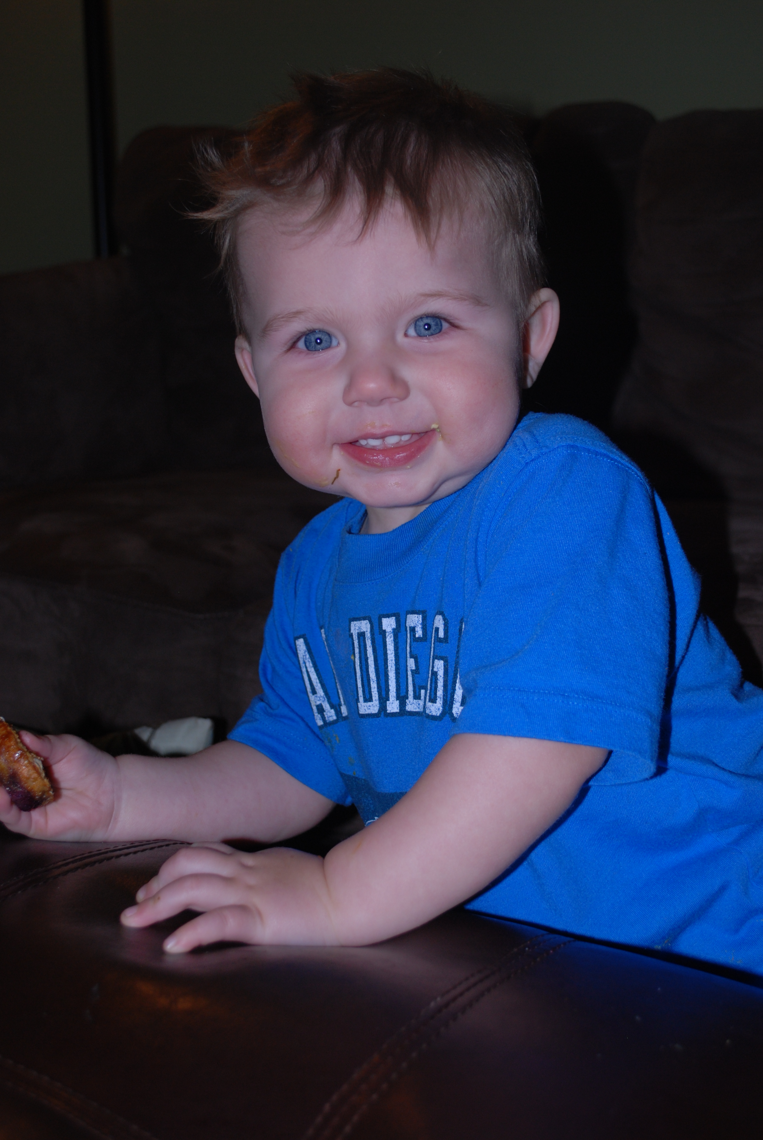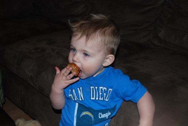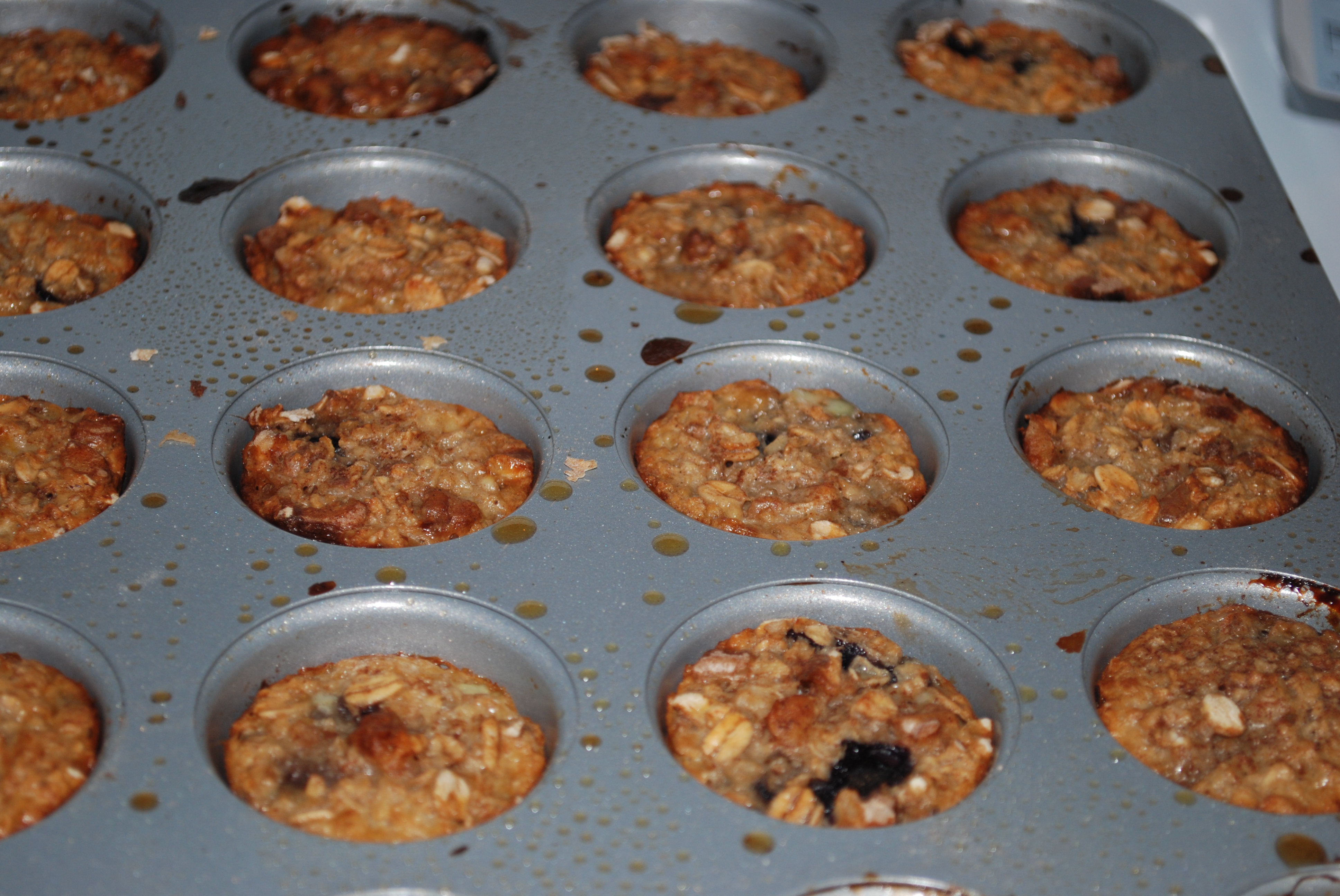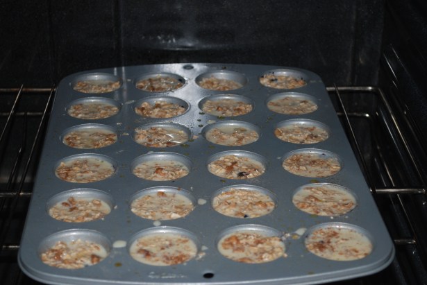 I am always trying to figure out new creative ways to get Bode to eat healthy and try new foods, and at this age he prefers to feed himself which means that my recipes need to be handheld. I made teething biscuits at one point and they were yummy but fell apart too easily, I’ve thought about granola bars but they might be a little tough for his teeth, so I decided to make Baked Banana, Blueberry, Oatmeal bars. This recipe was adapted from a recipe I found on SkinnyTaste.com but improvised to make mini muffins vs. bars. My son LOVES sweets so I wanted to make sure whatever I made tasted good but didn’t have too much sugar. The sugar in this recipe comes from honey and the fruit (bananas and blueberries) so its not too sweet but tastes just like oatmeal – YUM! I’d make this again as regular size muffins vs. mini muffins or serve it as bars for a ‘breakfast-themed’ event…