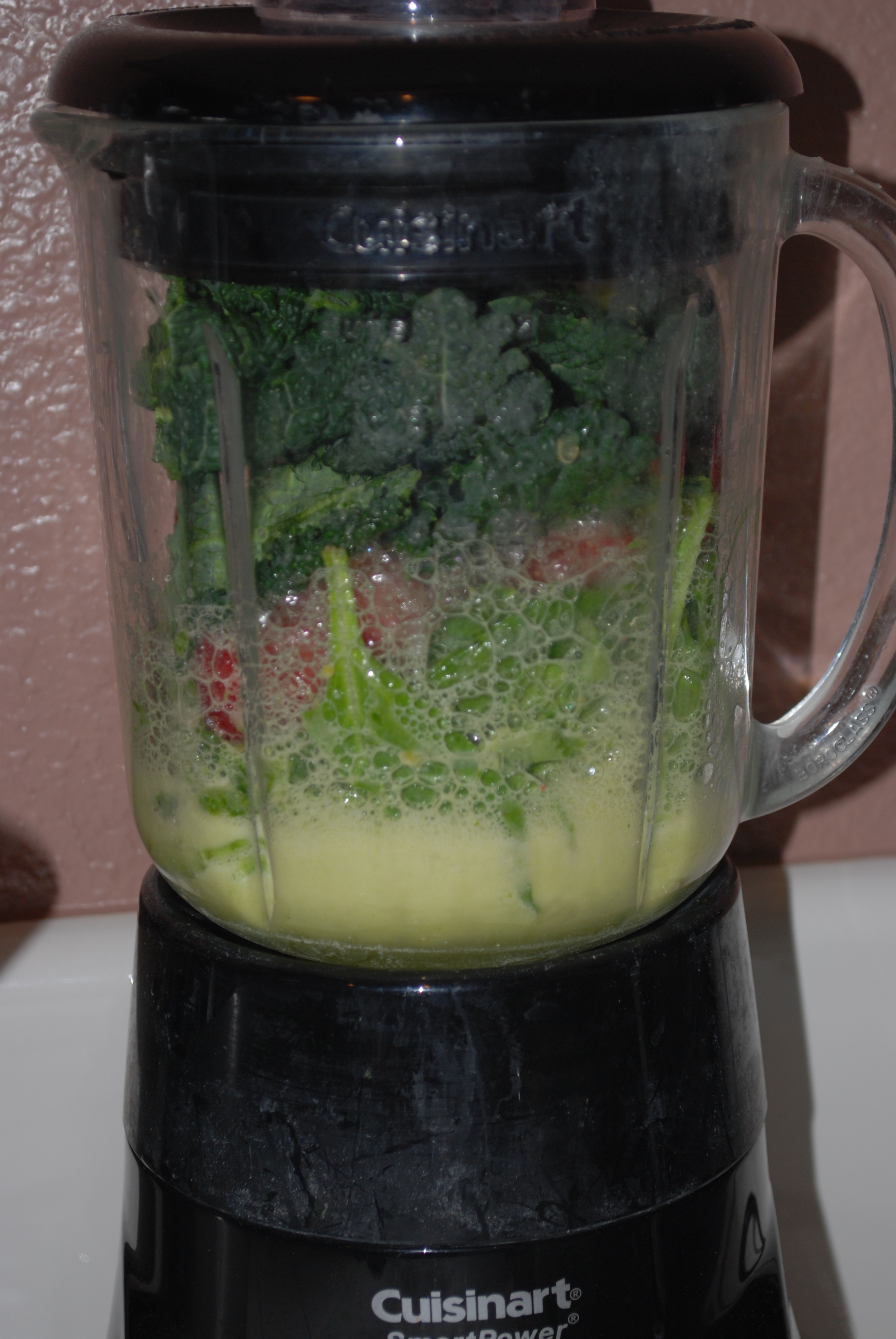 Step 2: About 1 cup of OJ goes into the blender, then add 2 cups of fresh organic spinach, about 1 cup of frozen strawberries, 1 banana (that I sliced and froze the night before), and 1 cup of fresh kale purchased at our local farmers market.
